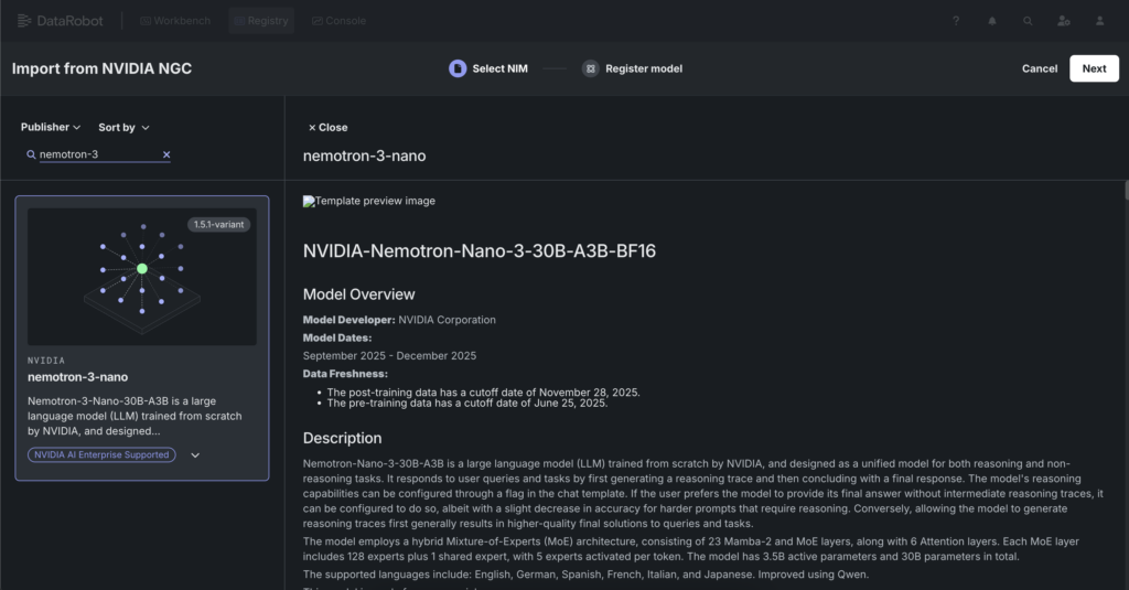 The Nebius benefit: DataRobot’s Agent Workforce Platform integrates with the Nebius Token Manufacturing facility, permitting builders to eat fashions like Nemotron 3 (and any open supply mannequin) on a pay-per-token foundation throughout the experimental part. This permits speedy, low-cost iteration with out heavy infrastructure provisioning. As soon as perfected, brokers can seamlessly transition from the Token Manufacturing facility to a devoted deployment (e.g., NVIDIA NIM) for enterprise scale and low latency.