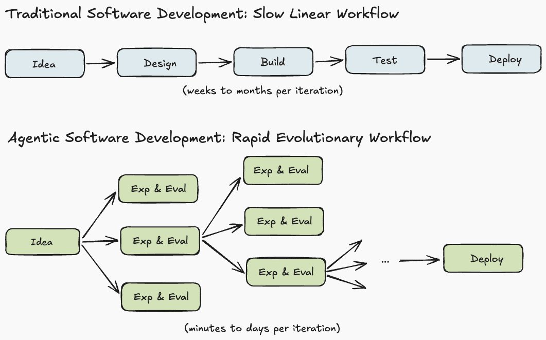 Brokers change this dynamic. Functions can now be generated, modified, and redeployed in minutes. As a substitute of constructing one rigorously designed system, builders and brokers more and more discover giant areas of potential implementations. Improvement begins to resemble an evolutionary algorithm: